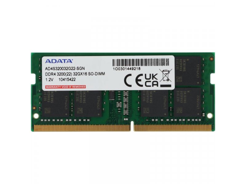 ADATA Premier AD4S320032G22-SGN — модуль оперативной памяти DDR4 объёмом 32 ГБ в форм-факторе SODIMM с тактовой частотой 3200 МГц, предназначенный для ноутбуков и компактных систем с поддержкой DDR4.