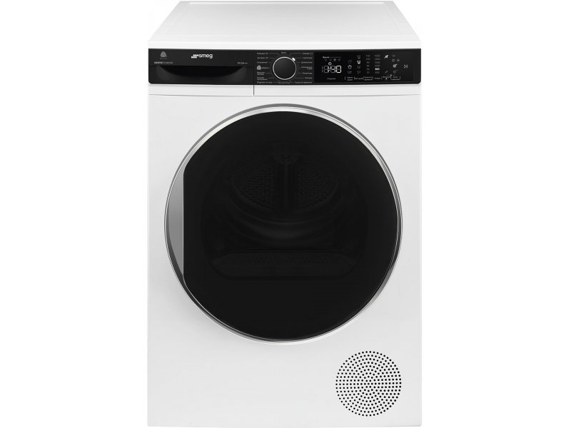 Smeg DT393RU4 — отдельностоящая сушильная машина с тепловым насосом и конденсационным типом сушки, загрузкой 9 кг, классом энергопотребления A+++ и 15 программами для различных типов тканей.
